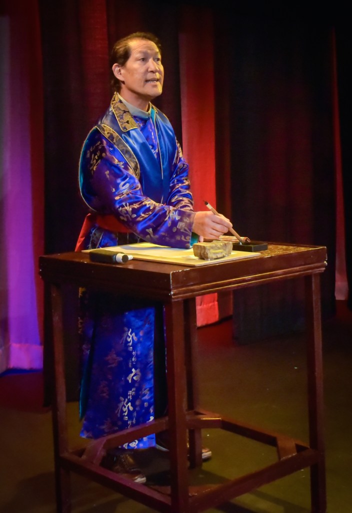 “Kanreki Blues,” written by Lisa Hadley, was performed at the 2015 Eight Tens @ 8 Play Festival in Santa Cruz, CA. Kanreki is a Japanese recognition of “your life has completed a circle,” and in the Japanese calendar of years, that is traditionally at 60 years. This play, deftly written by Ms. Hadley, had the unusual appearance of three different cultures colliding at this point for one modern and almost hapless main character: Chinese, Japanese, and American. The director only asked me one question while talking to me about my role as a reconstituted Sun Tzu: “Do you have any Chinese costumes?” “Oh yeah,” I said, “what would you like?” We decided on this reproduction of a Beijing opera robe.